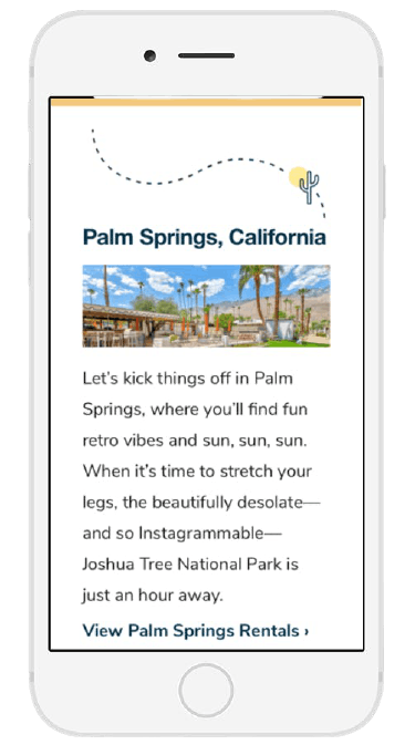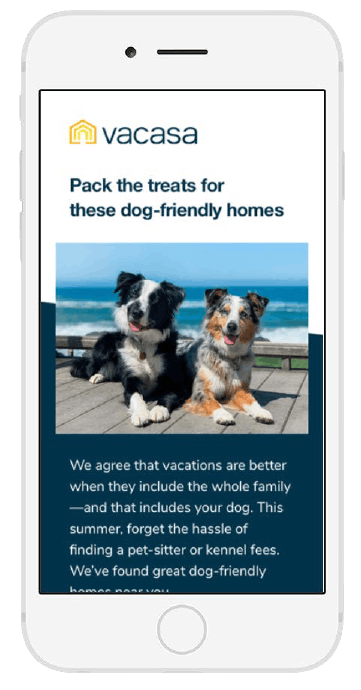 More and more people are consuming emails on their smartphones or other mobile devices. That’s why every email you send out has to render perfectly on mobile platforms. If they don’t, it’s likely your email will quickly end up deleted. Fortunately, making emails mobile-friendly is easy—just choose mobile templates in whichever email marketing software you’re using. This means the template is already optimized for a variety of devices. At Vacasa, we have a mobile-first strategy that ensures all our emails are just as stunning and effective no matter how subscribers are viewing them.