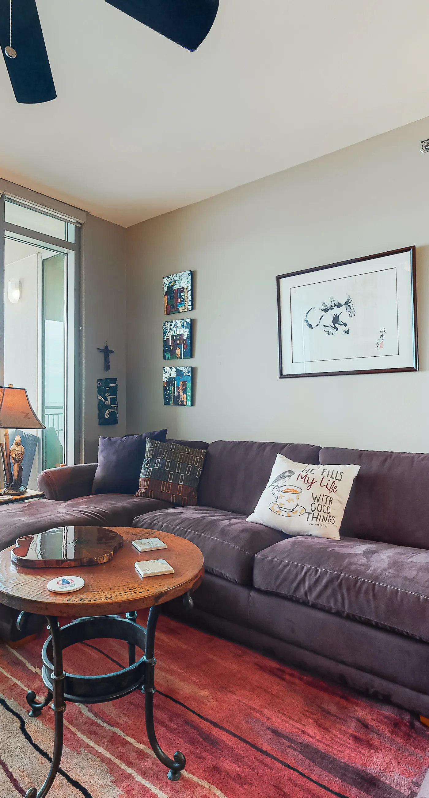 I was also really impressed with how thoughtfully the space is designed: every inch of the apartment is carefully planned, offering both privacy and the option to gather together, all within a relatively small area — without sacrificing coziness. There’s a beautiful rug in the living room, a table and chairs (very comfortable despite being tall!), warm lighting above the table, lovely fish-themed decor in the hallway and bathroom, a cozy bedroom, and a perfectly designed children’s bed — the kids are close by but still have their own enclosed space where they can have some privacy.